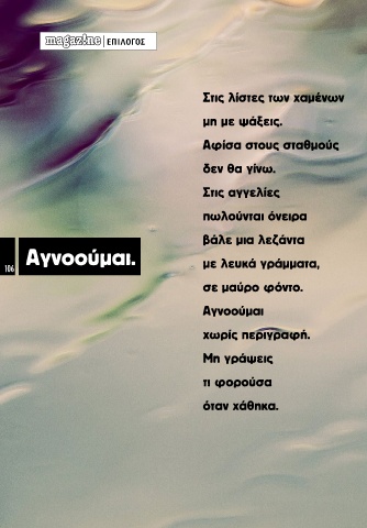 ΕΠΙΛΟΓΟΣ Στις λίστες των χαμένων μη με ψάξεις. Αφίσα στους σταθμούς δεν θα γίνω. Στις αγγελίες πωλούνται όνειρα βάλε μια λεζάντα Αγνοούμαι. 106 με λευκά γράμματα, σε μαύρο φόντο. Αγνοούμαι χωρίς περιγραφή. Μη γράψεις τι φορούσα όταν χάθηκα.