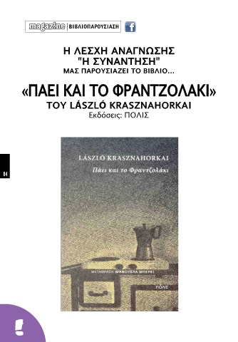 ΒΙΒΛΙΟΠΑΡΟΥΣΙΑΣΗ Η ΛΕΣΧΗ ΑΝΑΓΝΩΣΗΣ "Η ΣΥΝΑΝΤΗΣΗ" ΜΑΣ ΠΑΡΟΥΣΙΑΖΕΙ ΤΟ ΒΙΒΛΙΟ... «ΠΑΕΙ ΚΑΙ ΤΟ ΦΡΑΝΤΖΟΛΑΚΙ» ΤΟΥ LÁSZLÓ KRASZNAHORKAI Εκδόσεις: ΠΟΛΙΣ 84 !